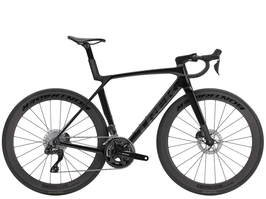 Madone 8 w całości z włókna węglowego, zwężana rura sterowa z włókna węglowego, wewnętrzne prowadzenie przewodów hamulca, hamulce tarczowe flat mount, sztywna oś przelotowa 12 x 100 mm ze skosem